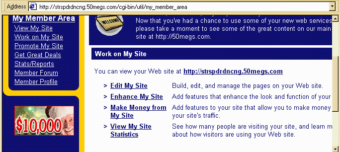 After you have signed up with 50megs, when you "Sign In" you will be in the "Member Area." Click on Work on My Site in the Menu to the left and you will go to a page titled Build My Site with these choicesManage Files: The File Manager lets you view all the files in your Web space and rename, move, copy, or delete them. You can also use our HTML editor to view and edit the code behind your Web pages.